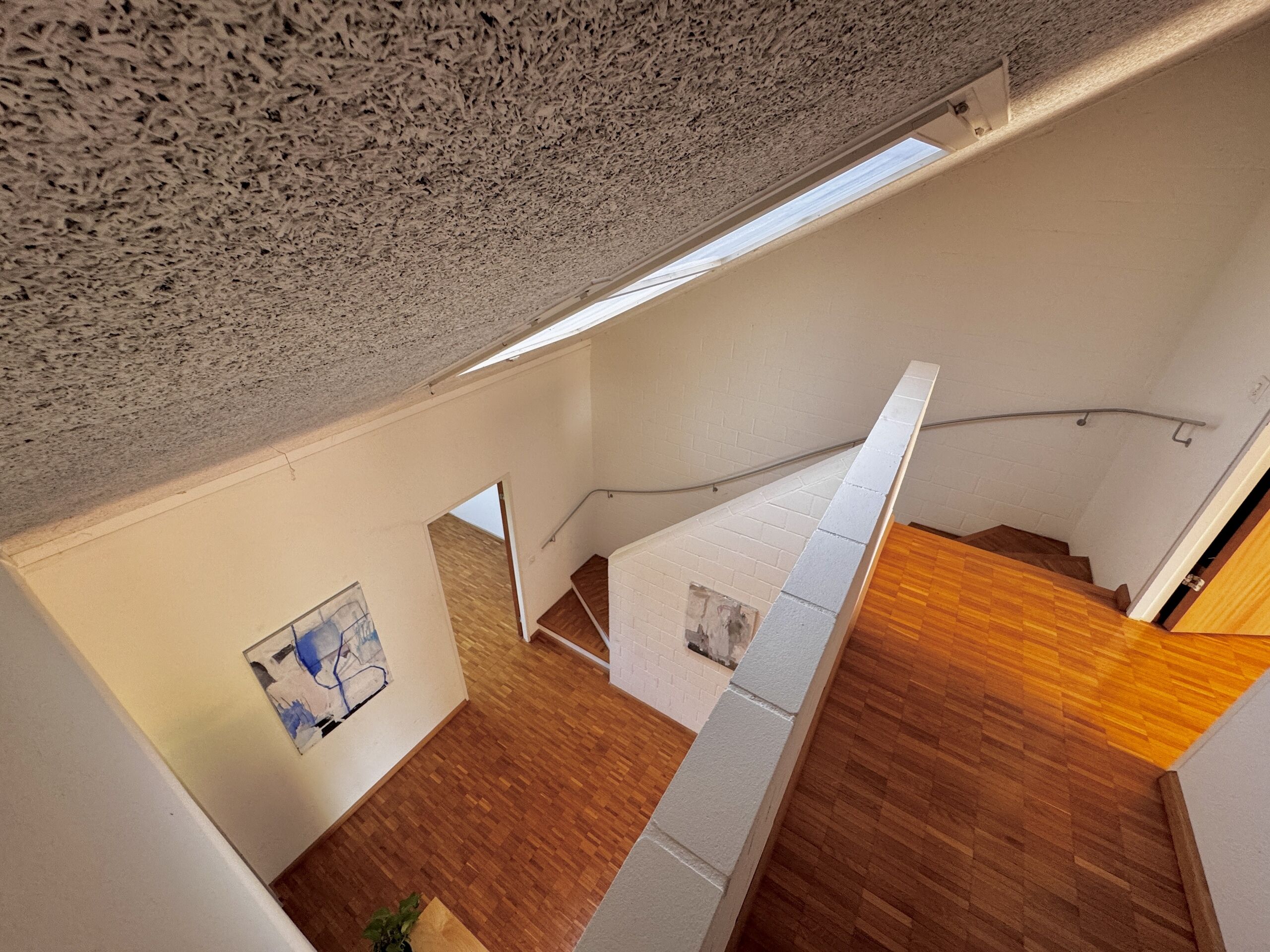 Inside, you will find an open, modern kitchen that flows seamlessly into the living area, while the gallery on the upper floor and bright skylights create a special living atmosphere. The space on offer is complemented by a practical hobby room, plenty of storage space in the basement and a shared laundry room with a separate drying room (Secomat). There is also a balcony for relaxing hours and plenty of privacy. Visitor parking spaces and a private outdoor parking space ensure convenient parking. Extensive renovations have been carried out in recent years, which are listed in detail in the appendix.